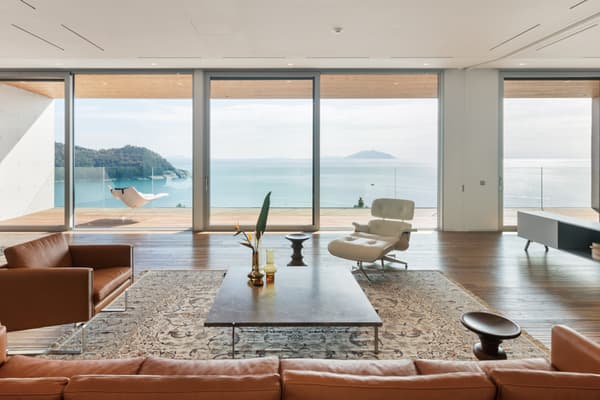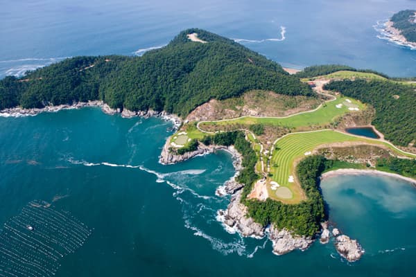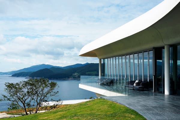 South Cape Spa and Suites is a resort complex facing the South Sea on the Korean Peninsula, where you can also enjoy playing golf. This luxury resort, which is open to the sea, offers guests the ultimate in relaxation. The concrete walls undulate like waves along the building, creating a dynamic appearance that makes it seem to float in the sky. Guest rooms are furnished with DUX beds and Ligne Roset furnishings, and you can enjoy a Geneva sound system. In addition, the rooms feature Aesop amenities. Don't miss the rare pianos and artwork scattered throughout the building.